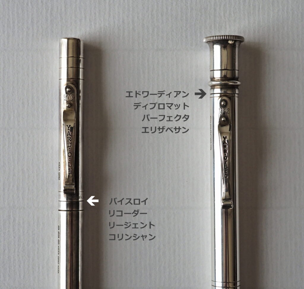 また、同じ銀軸モデルでありながら、バイスロイとエドワーディアンではペン先の繰り出し操作部が異なり、バイスロイをはじめ、リコーダー、リージェント、コリンシャンはキャップ部(クリップの下が可動部)を捻り芯出しを行うのに対し、エドワーディアン、ディプロマット、パーフェクタ、エリザベサンは天冠が操作部となっています。