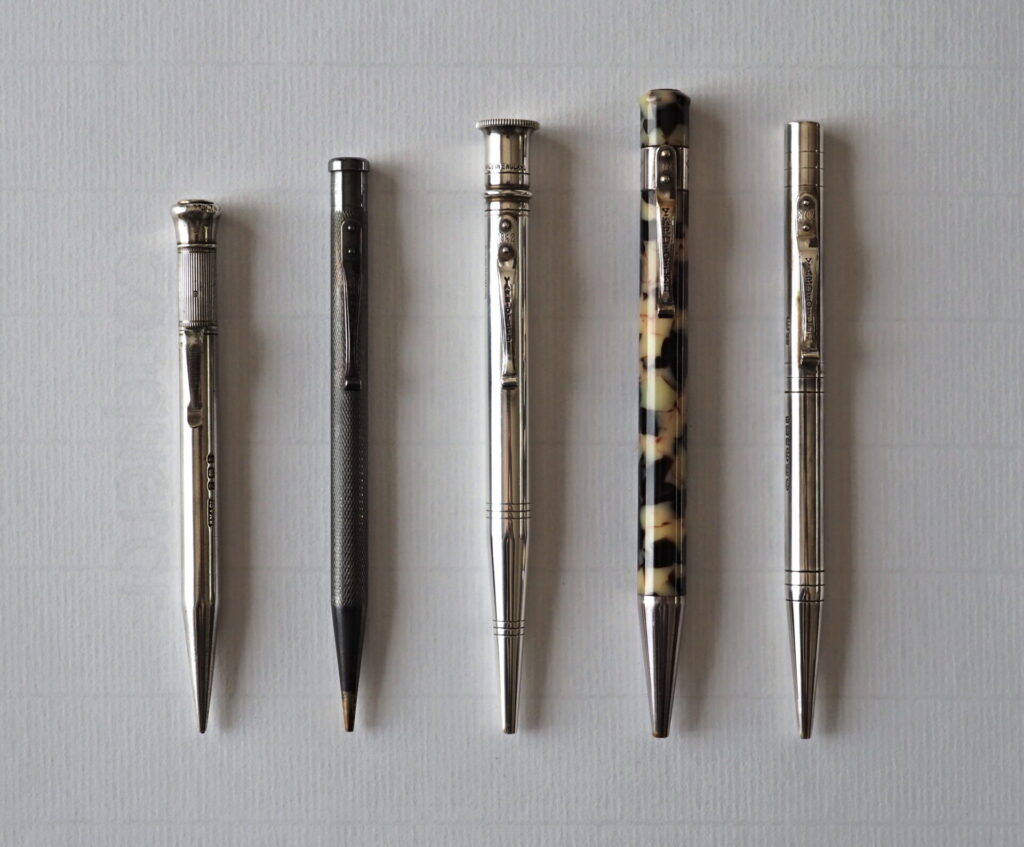 ▲左から、サンプソン・モーダン エヴァーポイント(1930年製)、ヤード・オ・レッドのディプロマット(1959年製の丸軸)のペンシル、エドワーディアン(1997年製)、アストリア(2010年製)、バイスロイ(2015年製)。