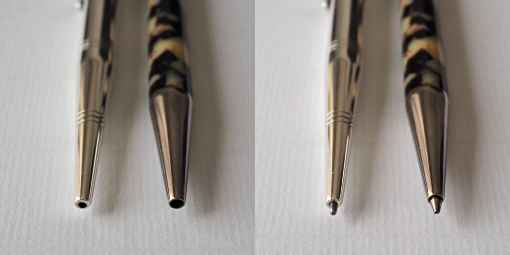 適合リフィルの仕様もあって軸は太く作る必要があり、口金から出るペン先も太くなります。