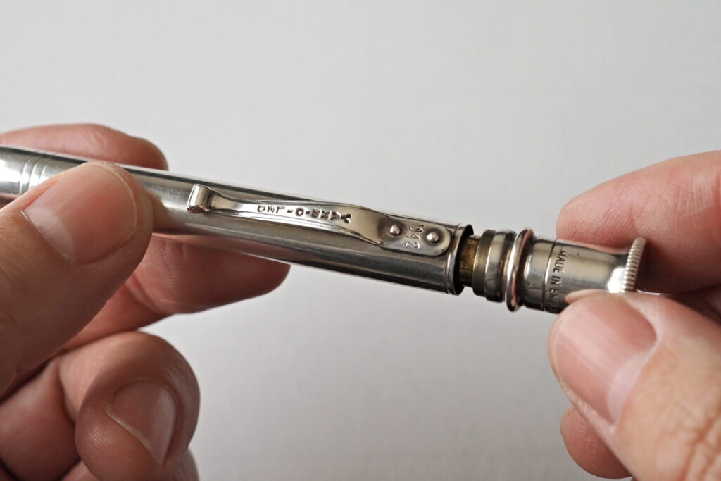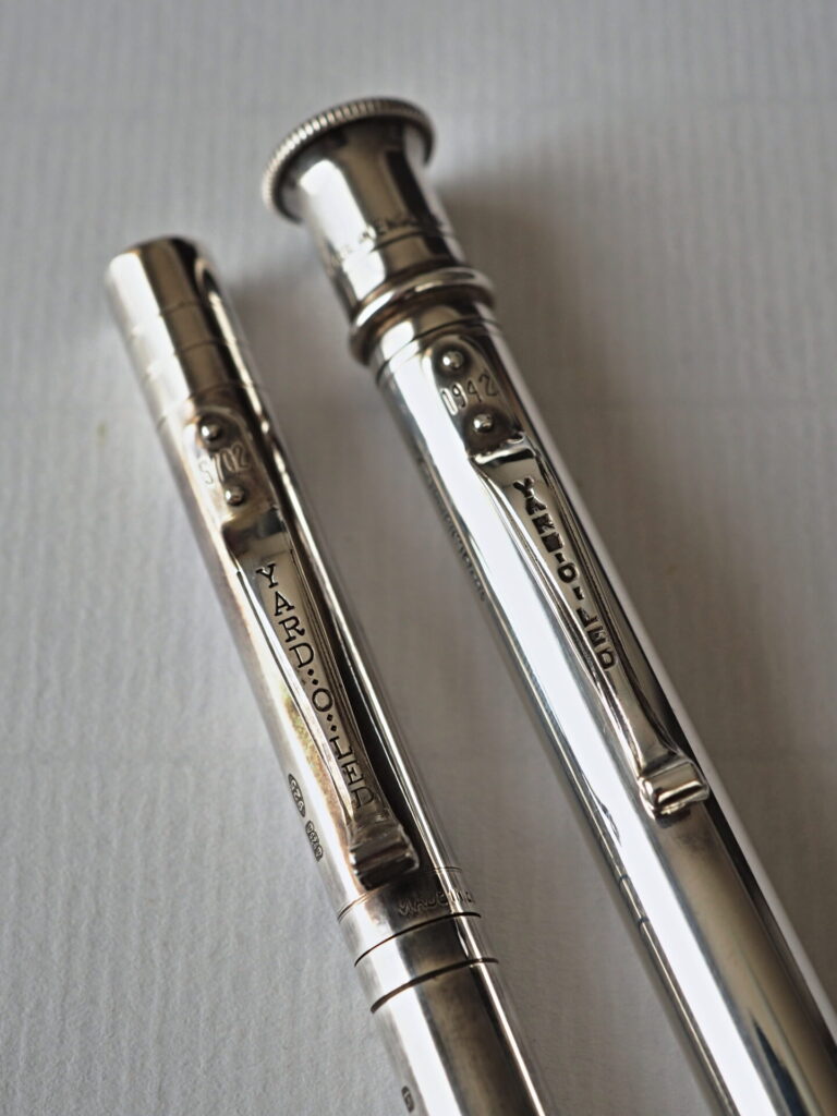 ヤード・オ・レッド銀軸筆記具の面白さは、同じモデルでも製造年代によってクリップのロゴ刻印(YARD-O-LEDなのかYARD‥O‥LEDなのか)や、軸の模様(プレーンなのかバーレイなのか)等が様々である点も一つとしてあるでしょう。