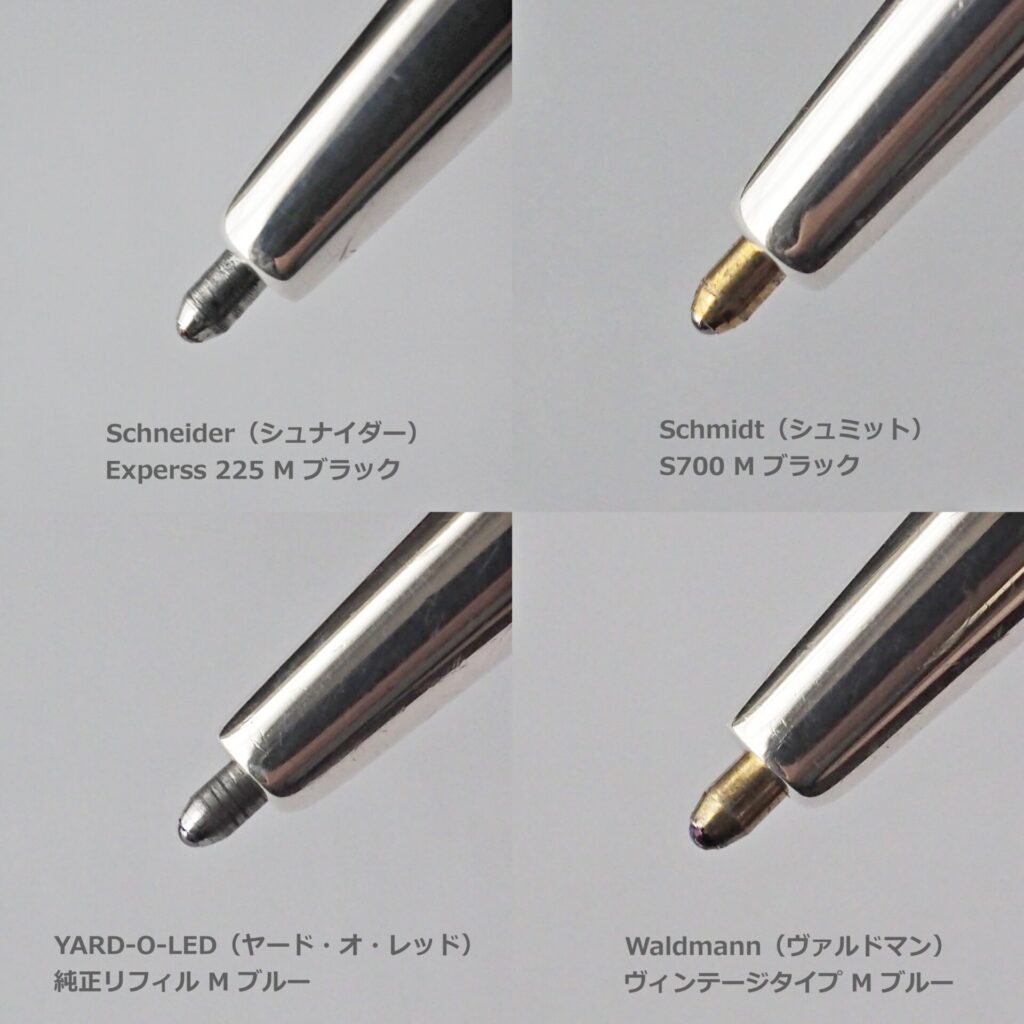 シュミットやヴァルドマンはリフィルの先が真鍮色、ヤード・オ・レッド純正やシュナイダーはシルバー(ニッケルかステンレスか何か)となるため、軸とのマッチングや装填しているインクの色でメーカーを変えてみるのもいいかもしれません。