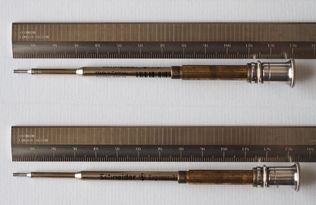 シュナイダーのExpress 225は、リフィルの頭部分が樹脂製で他のオール金属製G1規格リフィルと比べてこの部分の径が小さくなっています。(G1規格として全長と最大軸径の値はクリアしている)