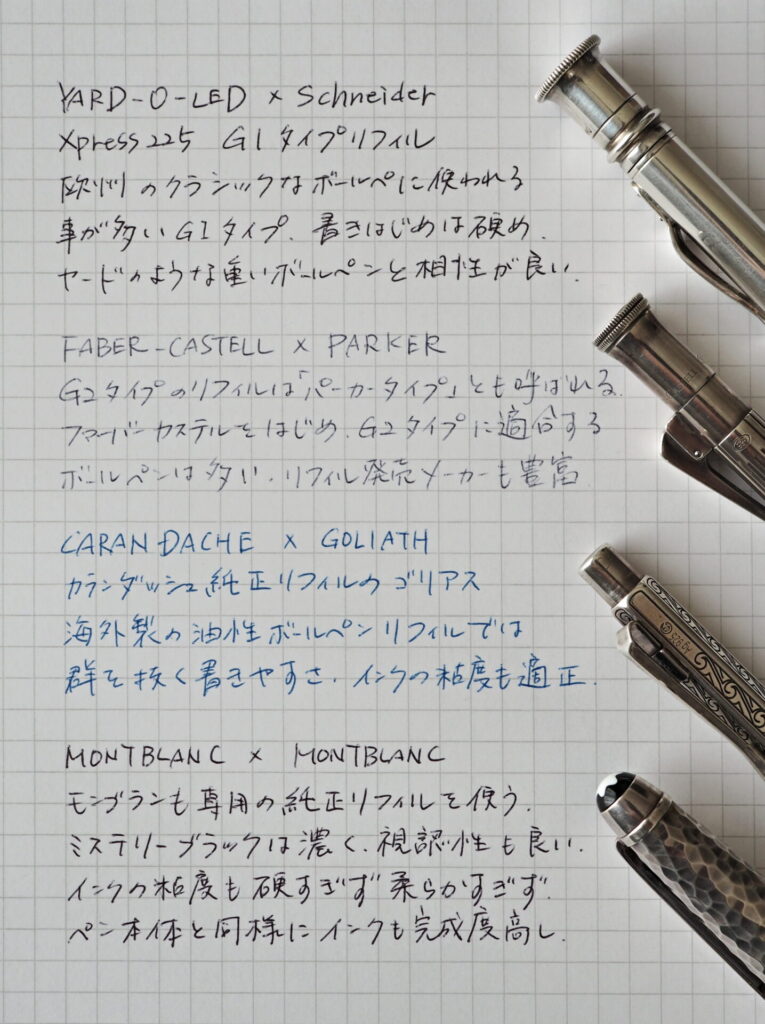 この中ではヤード・オ・レッドとファーバーカステルが国際規格のリフィルに対応。カランダッシュとモンブランは独自規格のリフィルとなっています。