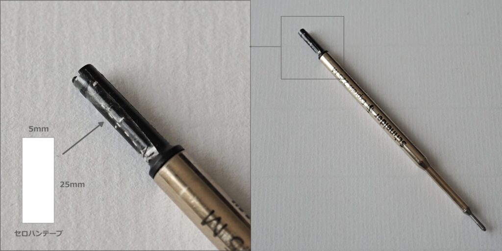 純正リフィルを装填する時の手応えを参考に色々試した結果、縦25mm(樹脂部分の縦幅と同じ)、横5mmにカットしたセロハンテープがベストという結論に至りました。