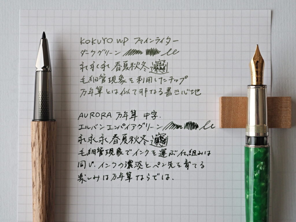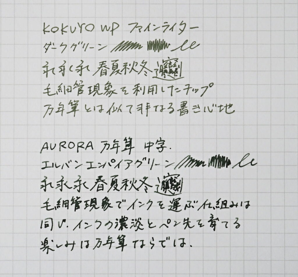 写真はWPファインライターのダークグリーンと、万年筆(AURORA)インクのエルバン グリーン系インク「エンパイアグリーン」を書き比べたもの。