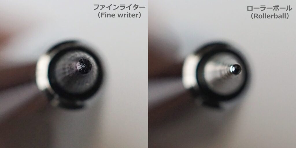 右は同じくWP ローラーボールリフィルのペン先。こちらはペン先のボールを転がしてインクを出す機構は通常のボールペンと同じですが、インクの粘度が一般的なローラーボールのそれよりも低く、よりインクフローが潤沢となっています。