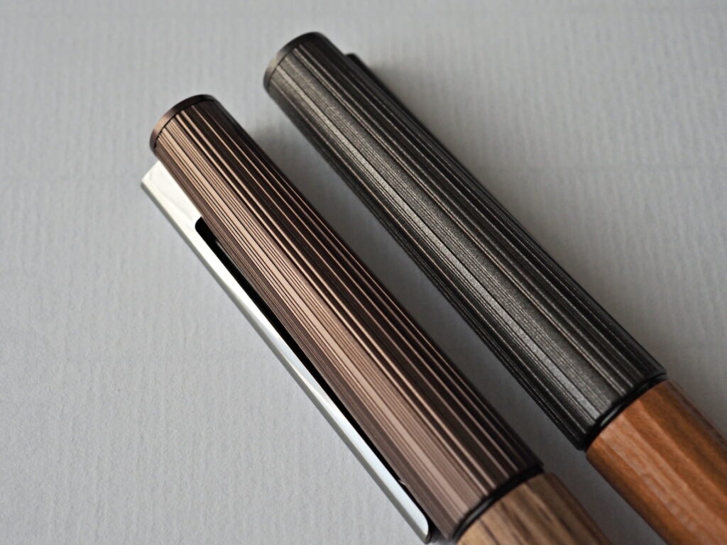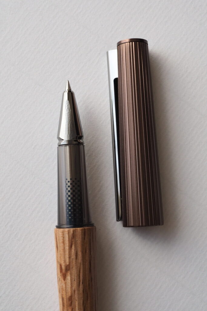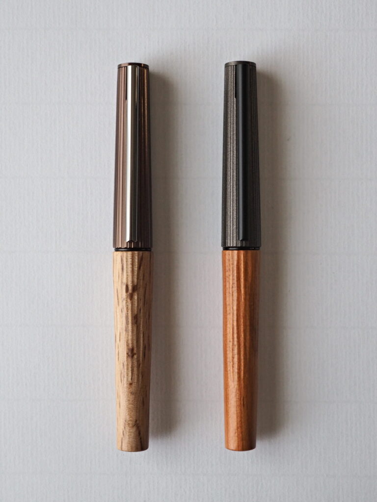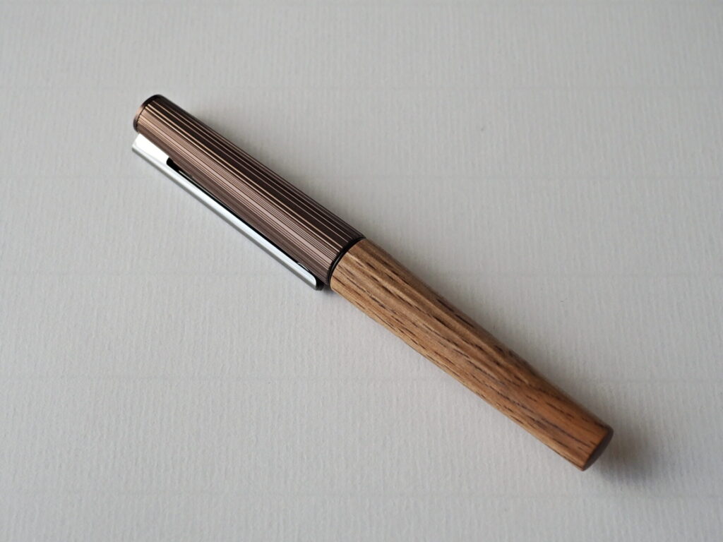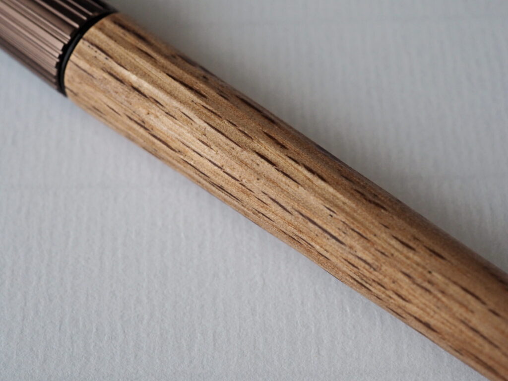 リミテッド第一弾のウワミズザクラはダークなキャップも相まってシックな印象でしたが、今回のイチイガシはクリップのシルバー、キャップのメタリックブラウン、そして胴軸に使われるイチイガシの虎斑が軽快な印象を与えます。