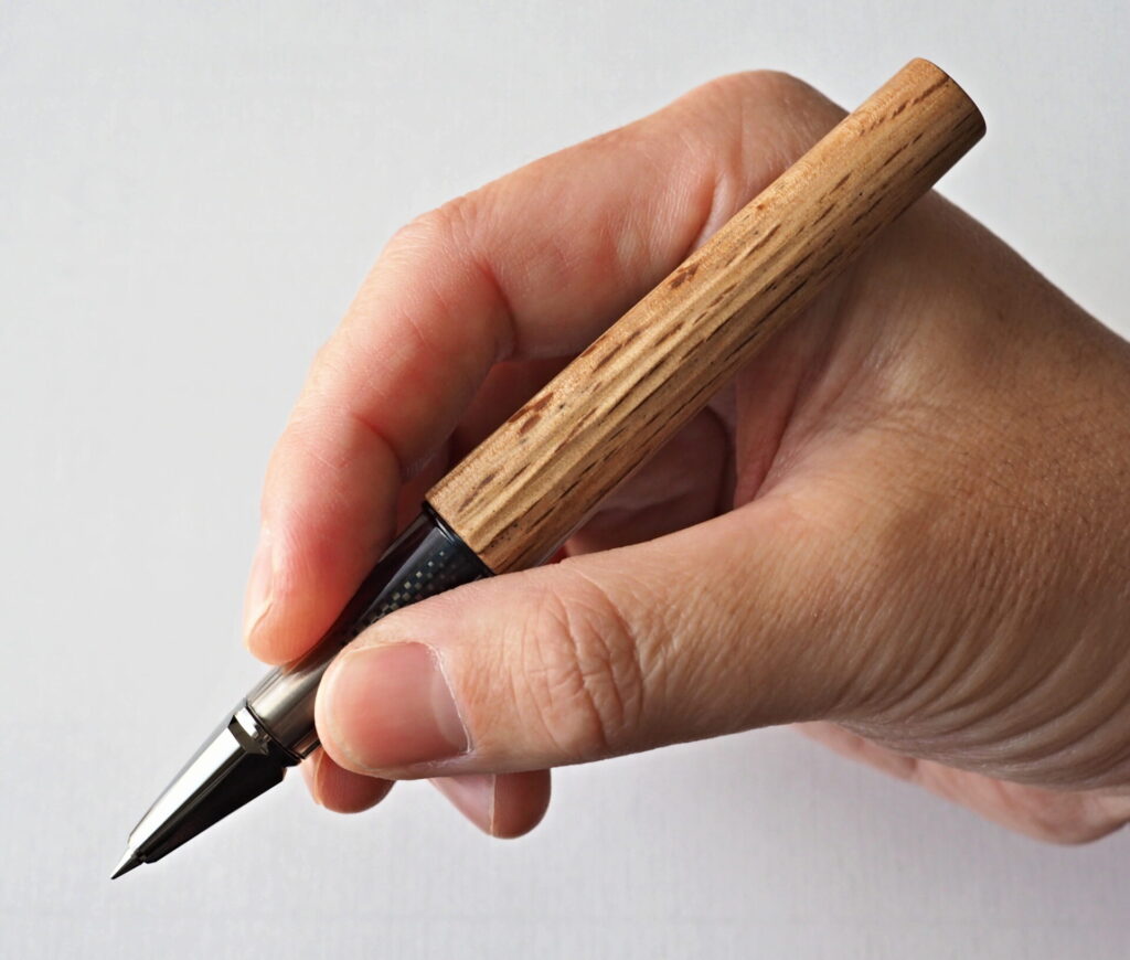 胴軸部分だけで金属、樹脂、木材の3種類の素材が使われ、筆記の命とも言えるグリップ部は10mmで太めであることと、また樹脂のグリップ感が握りやすさを担保してくれています。