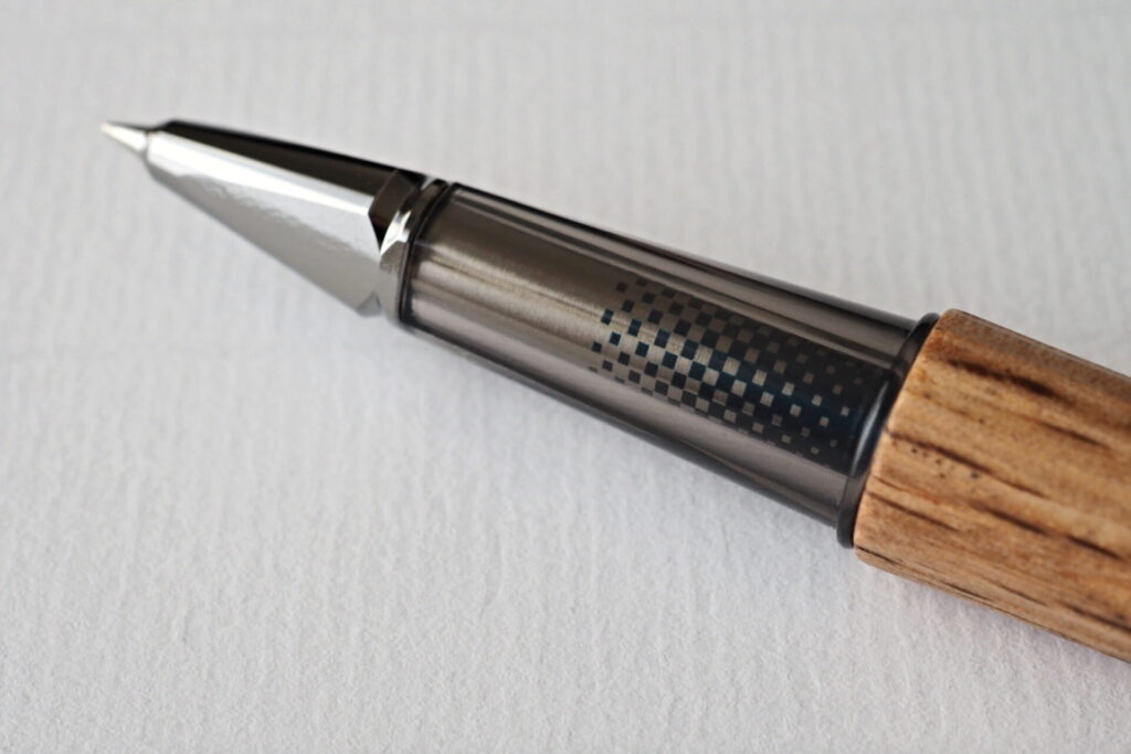 写真のローラーボールリフィルは市松模様ですが、ファインライターの方は鱗紋(三角版市松模様のような柄)となっており、筆記の際は中のリフィルがローラーボールなのかファインライターなのか一目で分かるようになっているのです。