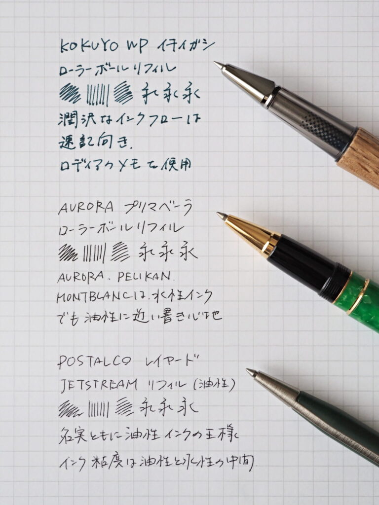 上から、WPローラーボール、アウロラの水性インク、低粘度の油性インクであるジェットストリーム。