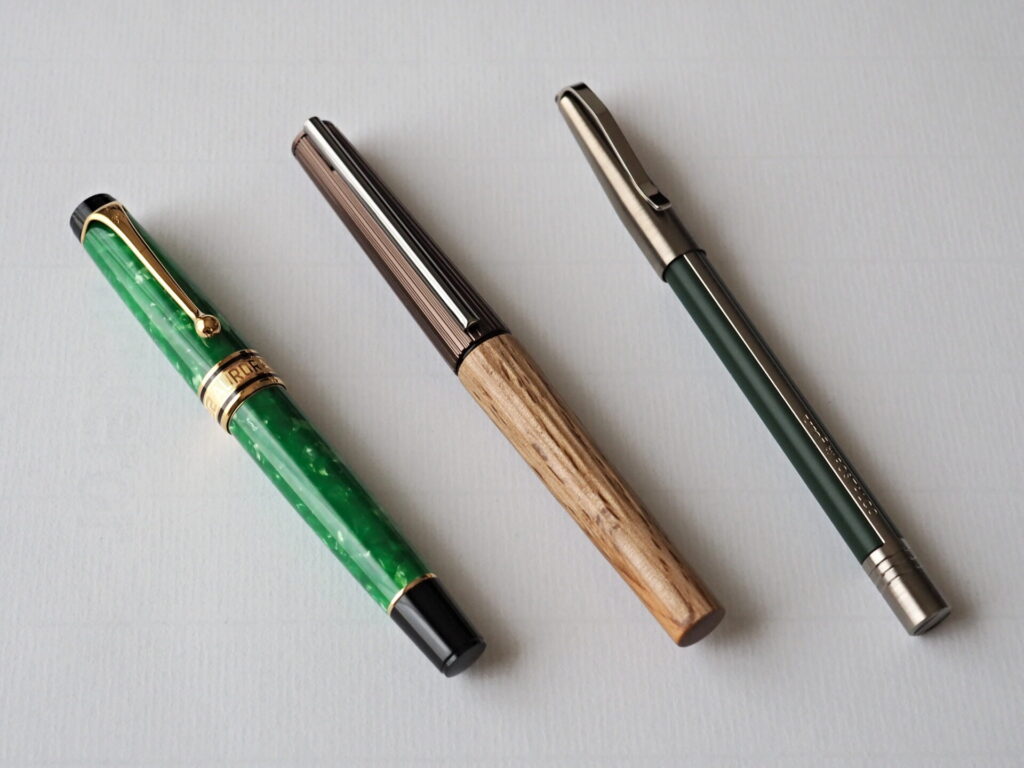万年筆には万年筆の良さがあり、普通に書くだけでインクの濃淡を愉しめる且つ、エルバンのエンパイアグリーンは特に、筆記直後から時間が経つにつれて色味がブラック寄りに変化していくのも愉しい。