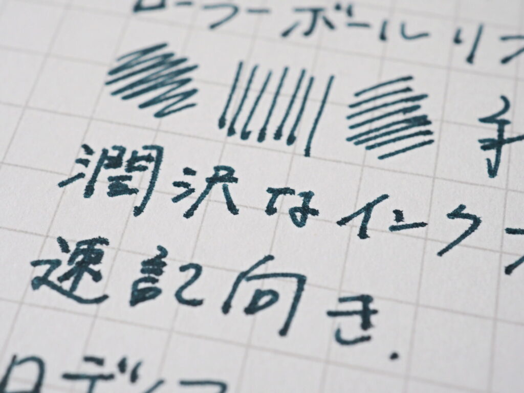 インクフローはペン先が紙面と触れている間、際限なく出てくるためじっくり書くよりは速記に向くインクとなります。